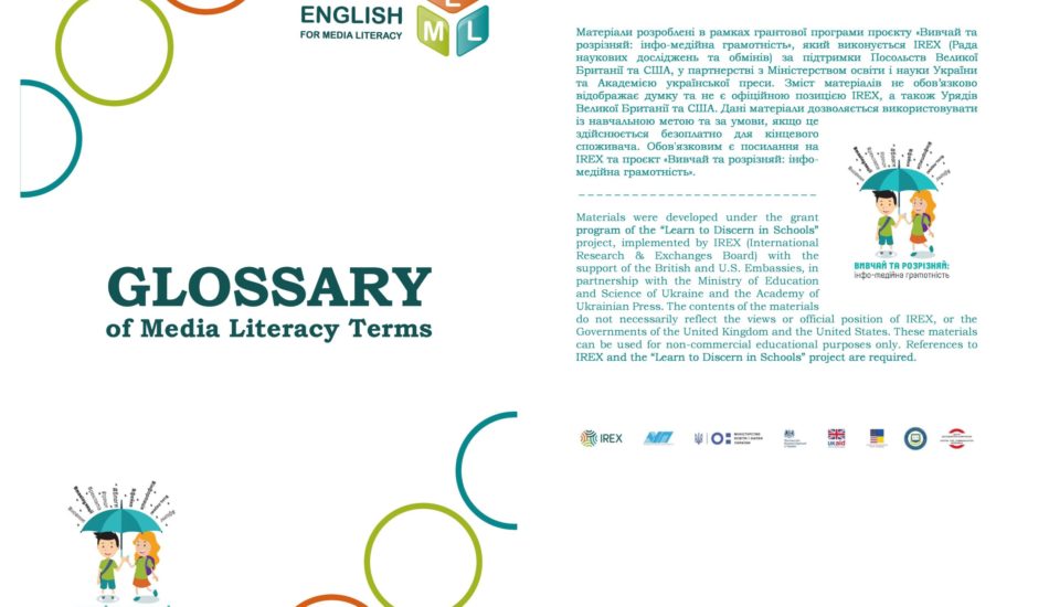 Проєкт «English for Media Literacy – Інфомедійна грамотність на заняттях англійської мови» реалізували кафедра англійської філології та ГО «Центр дослідження комунікації» за грантової підтримки Ради міжнародних досліджень та обмінів IREX за сприяння Посольств США та Великої Британії у партнерстві з МОН України та Академією Української преси.