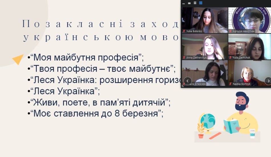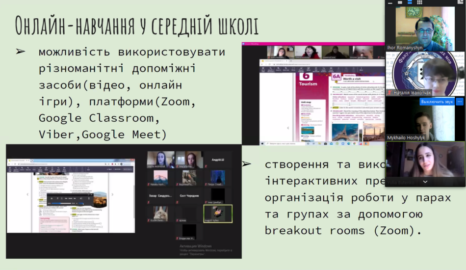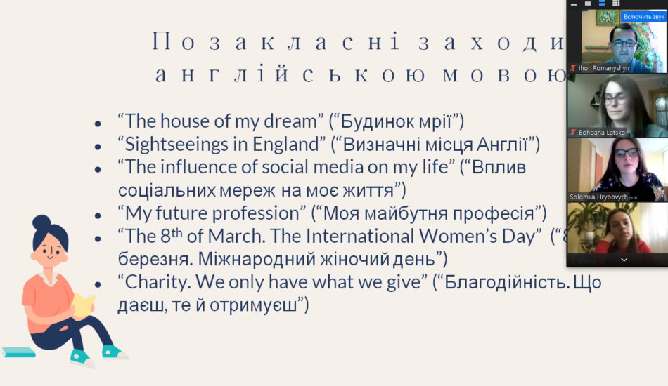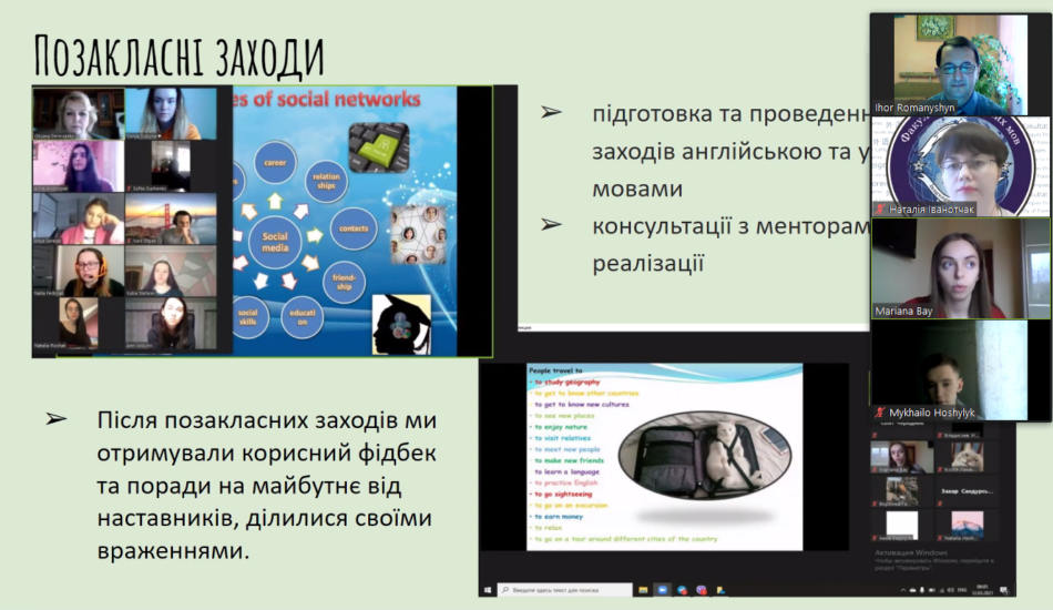 Студенти представили звіти-презентації про виконання ними завдань виробничої практики, поділилися своїми успіхами та отриманим практичним досвідом проведення ефективних оф-лайн та он-лайн уроків англійської мови, позакласних заходів з предмету, виховних заходів, психолого-педагогічного вивчення учнів, а також дослідження діяльності в рамках курсового проєкту з методики навчання англійської мови.