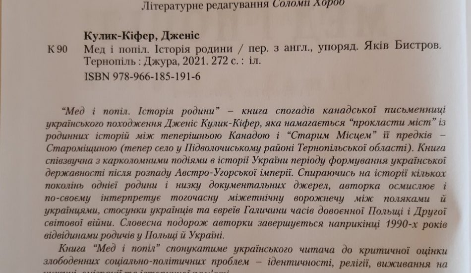 У книзі спогадів Дженіс Кулик-Кіфер намагається “прокласти міст” із родинних історій між теперішньою Канадою і “Старим Місцем” – Староміщиною (тепер село у Підволочиському районі Тернопільської області). Особливим непідробним стилем викладу Дж. Кулик-Кіфер уміло передає драматизм історичних подій в історії України періоду формування української державності після розпаду Австро-Угорської імперії. Спираючись на історії, отримані з уст представників кількох поколінь однієї родини, а також низку документальних джерел авторка пропонує свою версію тогочасної міжетнічної ворожнечі між поляками й українцями, стосунків українців та євреїв Галичини часів довоєнної Польщі і Другої світової війни. Словесна подорож авторки у пошуках власної ідентичності завершується відвідинами родичів у Польщі й Україні наприкінці 1990-х років. Книга “Мед і попіл. Історія родини” спонукатиме українського читача до критичної оцінки злободенних соціально-політичних проблем – ідентичності, релігії, виживання на чужині, еміграції та історичної пам’яті.