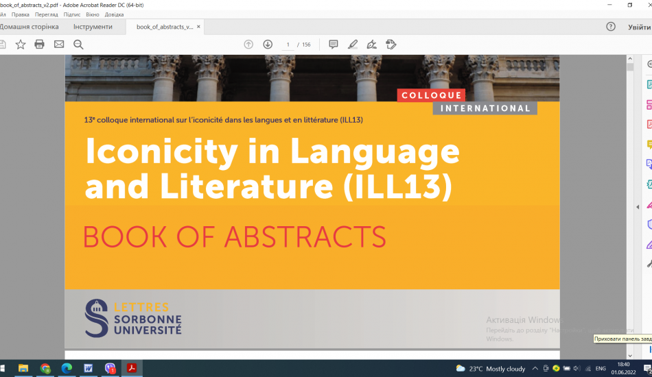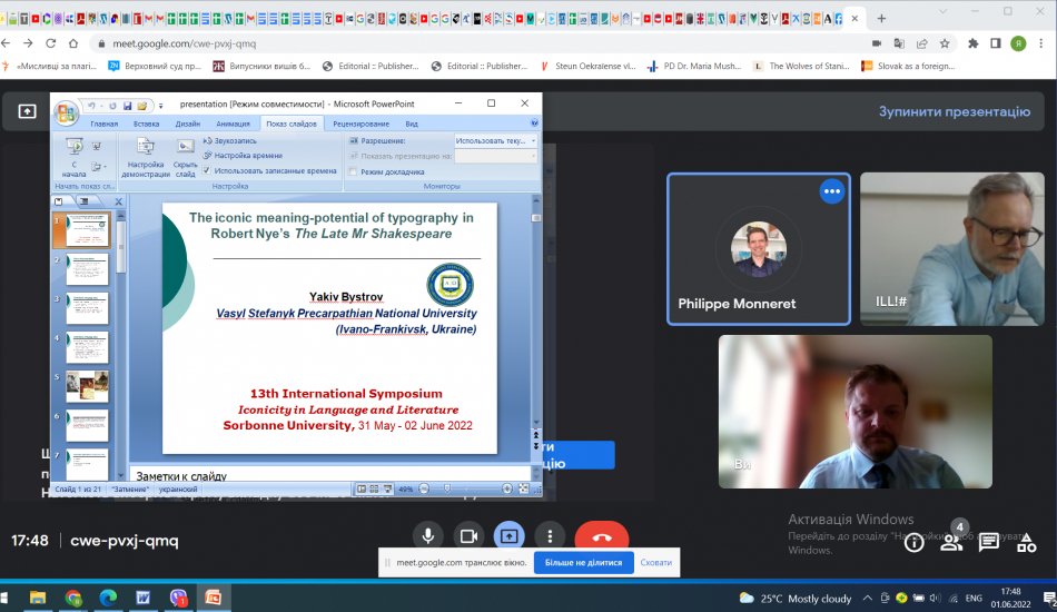 Завідувач кафедри англійської філології професор Яків Бистров взяв участь в 13 Міжнародному симпозіумі “Іконічність у мові і літературі (ILL-13)”, який цьогоріч відбувся в Університеті Сорбонна (Франція) впродовж 31 травня по 02 червня. Яків Бистров був єдиним представником з України з-поміж учасників з Франції, Німеччини, США, Великобританії, Японії, Італії, Іспанії та ін. (разом 18 країн). Доповідь «Іконічний смислотвірний потенціал друкарських знаків у романі Роберта Ная «Покійний містер Шекспір» (“The iconic meaning-potential of typography in Robert Nye’s The Late Mr Shakespeare“) присвячена аналізу іконічності як семіотичного принципу організації художнього тексту, а також іконічному використанню візуального висунення для висвітлення ключових елементів тексту крізь призму різноманітних шрифтів, підкреслень, великих літер тощо. Тема іконічності як вияв схожості між формою і змістом зберігає актуальність у царині не тільки досліджень зПмовознавства і літературознавства, а й досліджень семіотичних систем і медіа, включно жестів і музики, а також у міждисциплінарних галузях, якими є когнітивна наука і когнітивна семіотика. Семіотичний принцип іконічності у вигляді друкарських знаків у романі Роберта Ная слугує вдалим доповненням до методології мультимодальної стилістики і процесу смислотворення загалом.