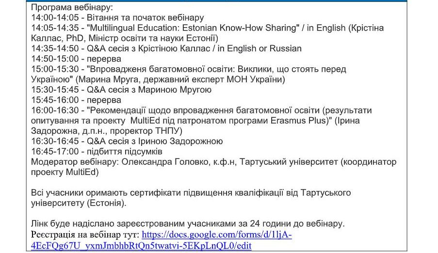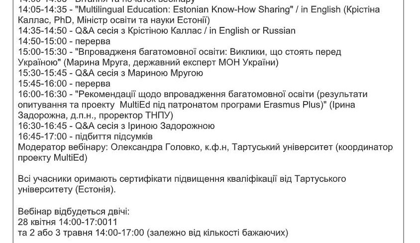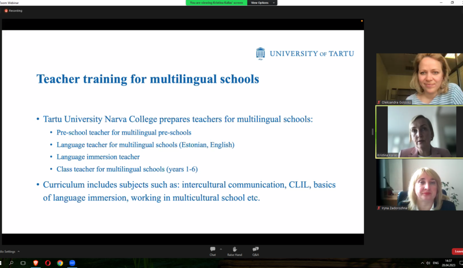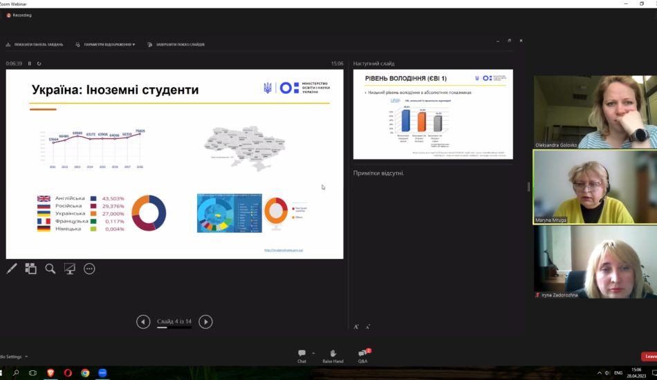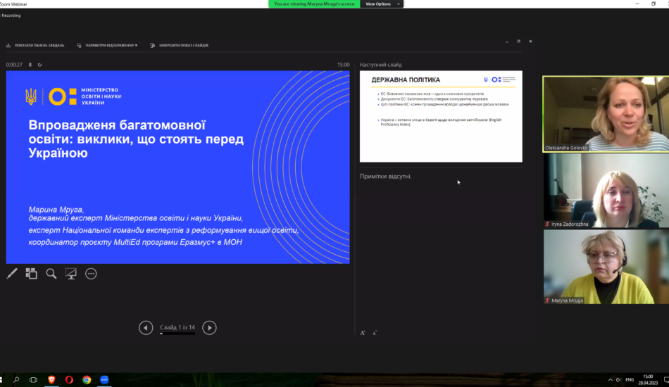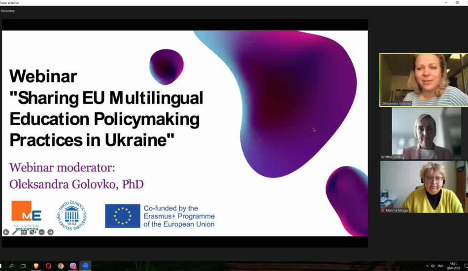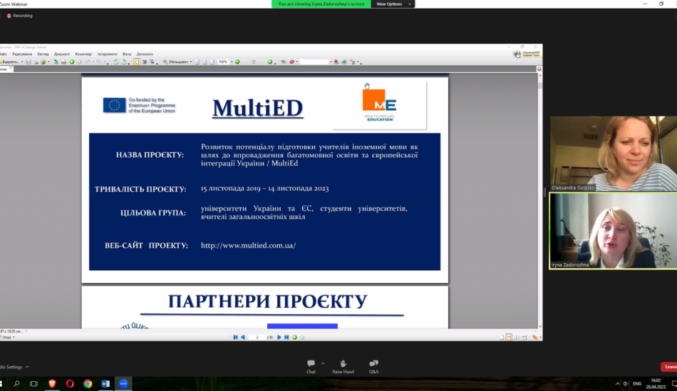 Викладачі факультету взяли участь у міжнародному вебінарі «Sharing EU multilingual education policymaking practices in Ukraine» у рамках реалізації проєкту Erasmus+ KA2 «MultiEd». Модератором заходу виступила координатор проєкту «MultiEd» Олександра Головко (Тартуський університет). Міністр освіти та науки Естонії Крістіна Каллас проаналізувала досвід Естонії та підходи Естонії до багатомовної освіти. Державний експерт МОН України Марина Мруга закцентувала увагу на викликах, які стоять перед Україною у процесі впровадження багатомовної освіти. Проректор з наукової роботи та міжнародного співробітництва Тернопільського національного педагогічного університету імені Володимира Гнатюка Ірина Задорожна висвітлила результати дослідження мовної ситуації в університетах України у 2020-2021 рр. Вона поінформувала про досвід упровадження нових курсів, створених із застосуванням європейського досвіду, а також результати використання електронного курсу «Методологія CLIL» на платформі «Moodle», що сприяє підвищенню кваліфікації вчителів та впровадженню CLIL-методології в освітній процес. На вебінарі також обговорювались основні положення Національних рекомендацій із розвитку багатомовної вищої освіти в Україні.