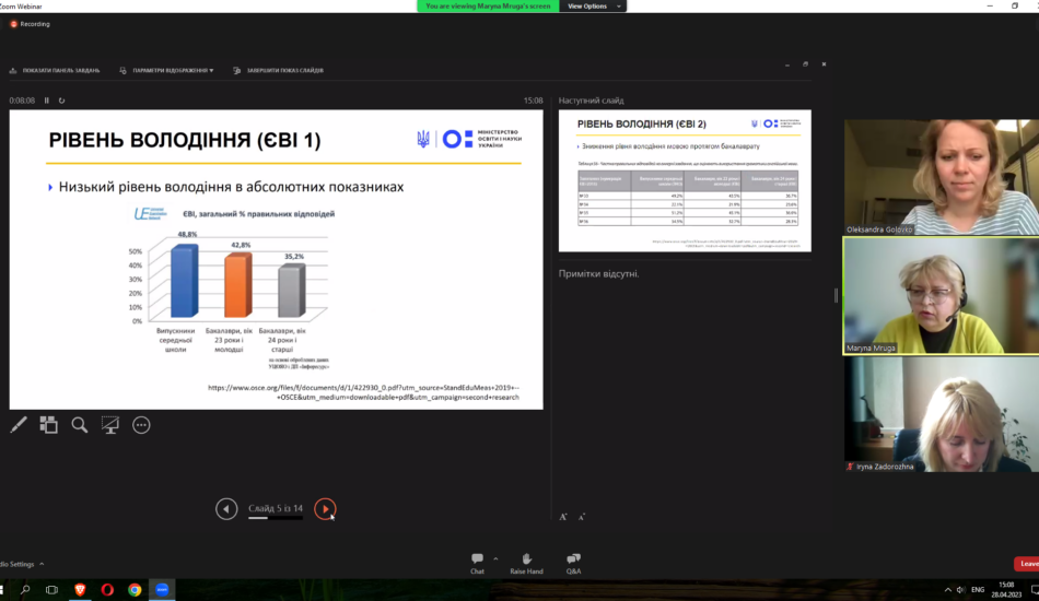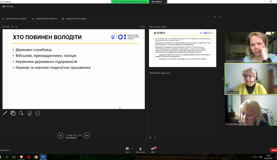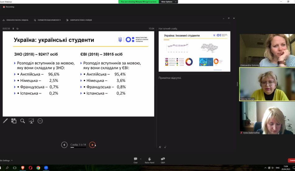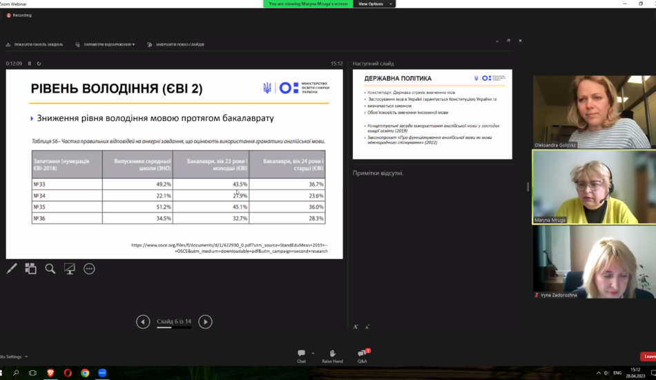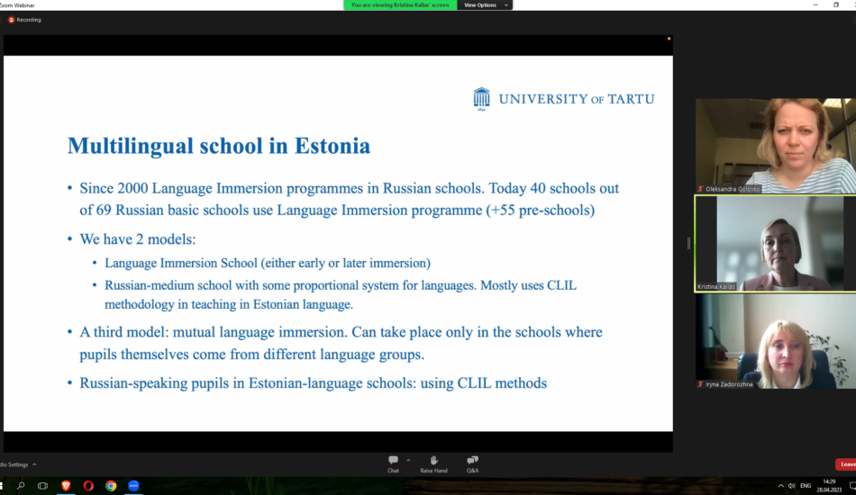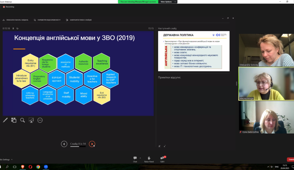 Викладачі факультету взяли участь у міжнародному вебінарі «Sharing EU multilingual education policymaking practices in Ukraine» у рамках реалізації проєкту Erasmus+ KA2 «MultiEd». Модератором заходу виступила координатор проєкту «MultiEd» Олександра Головко (Тартуський університет). Міністр освіти та науки Естонії Крістіна Каллас проаналізувала досвід Естонії та підходи Естонії до багатомовної освіти. Державний експерт МОН України Марина Мруга закцентувала увагу на викликах, які стоять перед Україною у процесі впровадження багатомовної освіти. Проректор з наукової роботи та міжнародного співробітництва Тернопільського національного педагогічного університету імені Володимира Гнатюка Ірина Задорожна висвітлила результати дослідження мовної ситуації в університетах України у 2020-2021 рр. Вона поінформувала про досвід упровадження нових курсів, створених із застосуванням європейського досвіду, а також результати використання електронного курсу «Методологія CLIL» на платформі «Moodle», що сприяє підвищенню кваліфікації вчителів та впровадженню CLIL-методології в освітній процес. На вебінарі також обговорювались основні положення Національних рекомендацій із розвитку багатомовної вищої освіти в Україні.